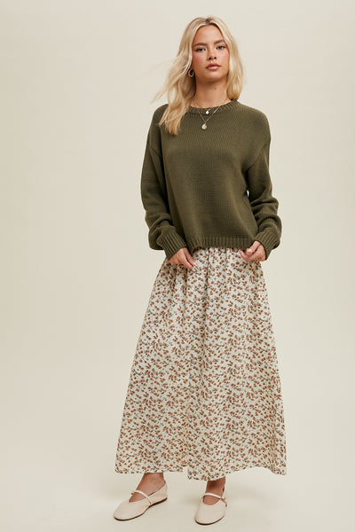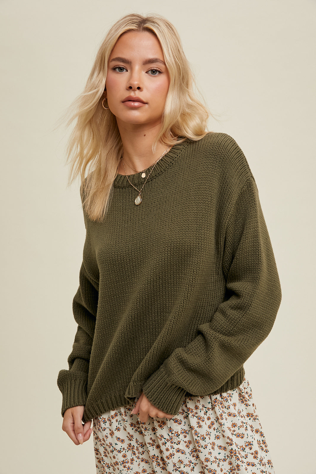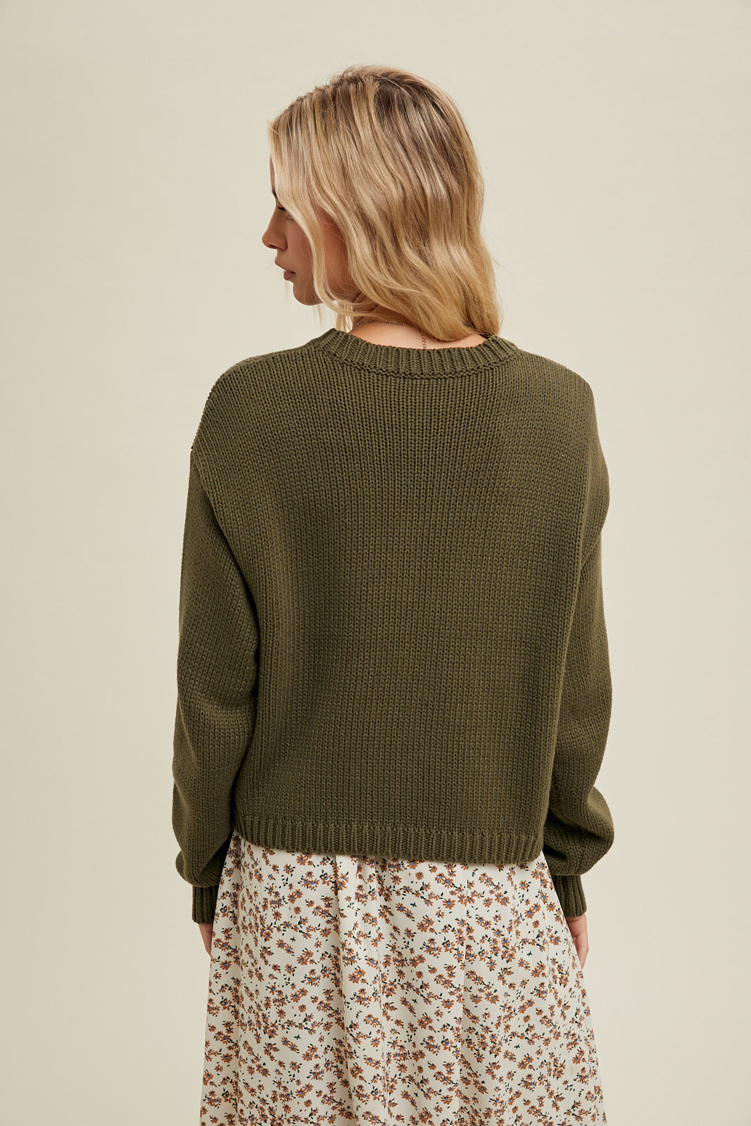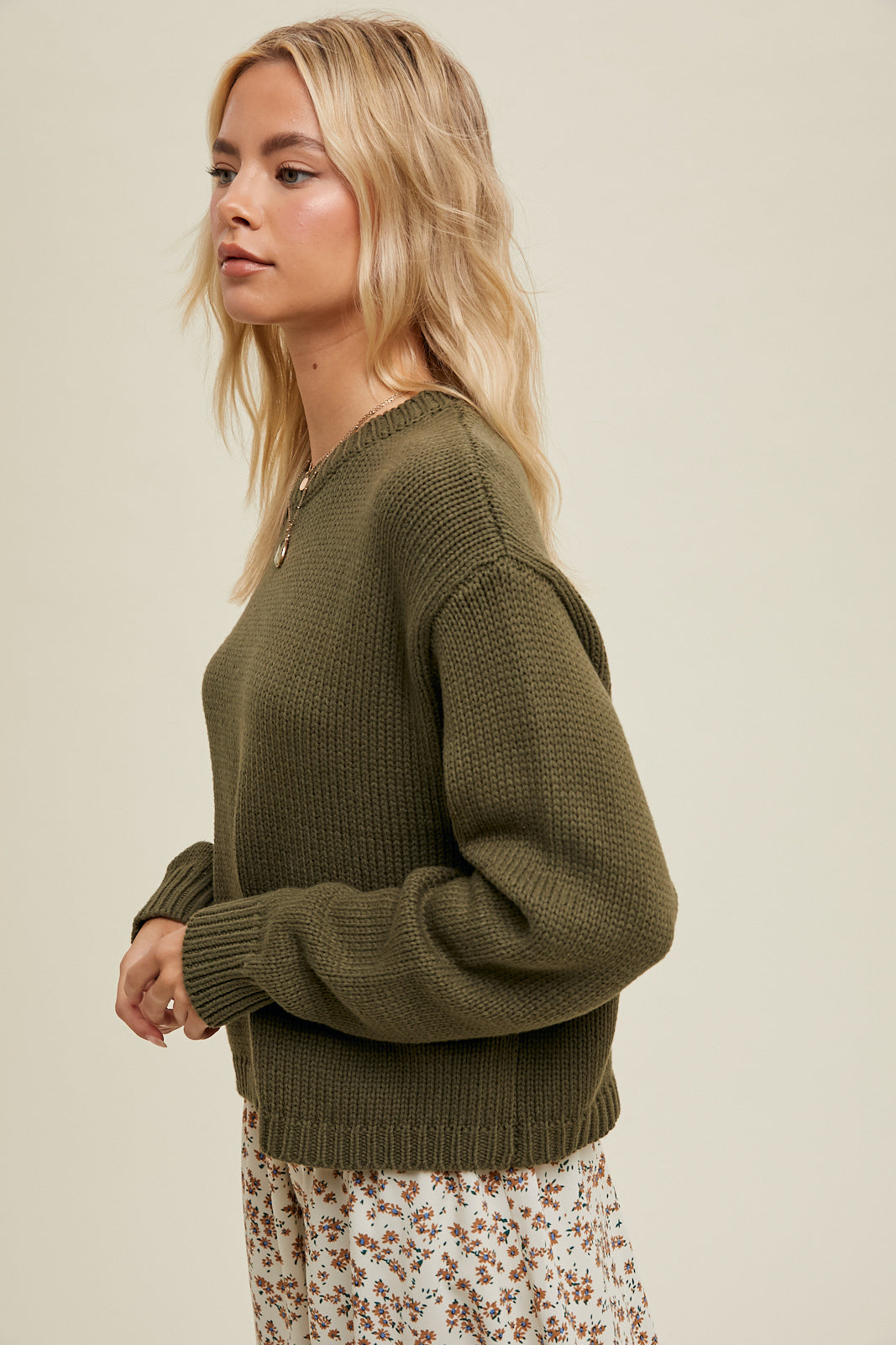 Drop shoulder cropped knit sweater.  This is an essential in any closet!  Pair with your favorite denim or skirt, you will live in this one!