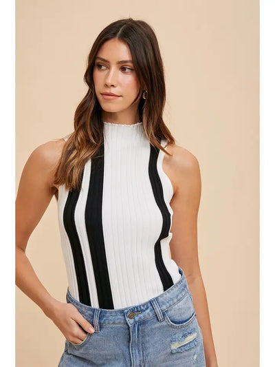 Vertical stripe, lettuce edge rib sweater tank! Perfect for layering or simply making a statement wearing alone! This fitted top is flattering and features the cutest raw edge hem.